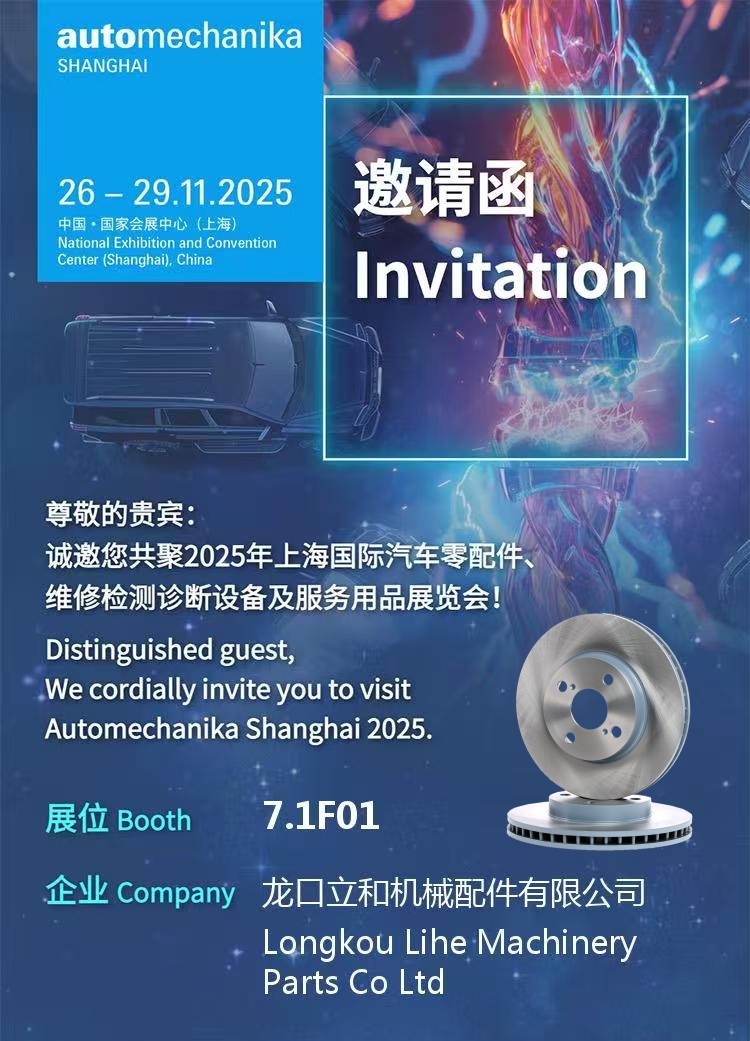 Lo invitamos cordialmente a visitarnos en Automechanika Shanghai 2025 (Stand N.º 7.1F01) y a explorar juntos las últimas tecnologías y tendencias del mercado en seguridad de frenado.Como fabricante profesional con muchos años de experiencia en la industria de los sistemas de freno, Longkou Lihe Machinery Parts Co., Ltd. presentará su completa gama de discos y tambores de freno de alto rendimiento, ofreciendo a los clientes de todo el mundo soluciones de frenado más seguras y duraderas.